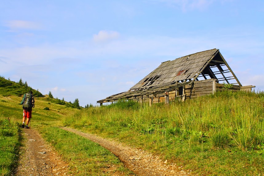Старт о 9.30. Практика вечері-сніданку економить час! Ранок був сонячний. Почали конкретно набирати висоту. Потім вийшли до галявини з колибою. Після чого звернули з червоної маркованої дороги і пішли напряму до полонини Лисичої. По маршруту знову перетнули Білий, потрапили в затишне урочище.